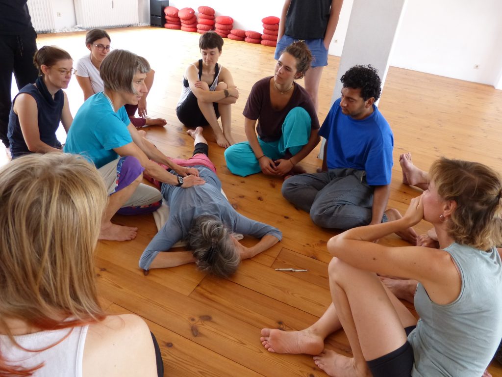 Body-Mind Centering® bietet mit seinem somatischen Ansatz, eine Möglichkeit, den eigenen Körper von der zellulären bis zur Makrostruktur (Körpersystem) zu erforschen. BMC-Stunden können sehr unterschiedlich aufgebaut sein in Abhängigkeit des Themas. Die Stunden beinhalten folgende Elemente in unterschiedlichen Reihenfolgen: eigene Bewegungsimprovisationen, inhaltlicher Input, Somatisierung, angeleitete Bewegungen, „Hands on“ (Berührungsarbeit alleine oder mit anderen), Integration in Bewegung/Tanz/Spiel, Austausch. Es geht um das eigene Verkörpern dieses Themas durch Somatisierung, Bewegung und Berührung. In der Stunde resoniert ein Körper auf seine Weise. Dabei ist eine neugierige Geisteshaltung eingeladen, sich auf das einzulassen, was sich aus der Resonanz herauszeigen möchte. Menschen können unterschiedlich resonieren, so dass verschiedene Bewegungsimpulse eine Diversität im Raum ergeben können, die wiederum durch die gemeinsame Geisteshaltung des Stundenthemas miteinander verbunden ist. Wie zeigen sich unterschiedliche Themen in Bewegung im eigenen Erleben? Austausch über das eigene Erleben bringt einen Moment der Reflektion und des gemeinsamen Teilens der Erfahrung. Was ermöglichen Dir Erfahrungen aus dem Body-Mind Centering® für Dein tägliches Leben?